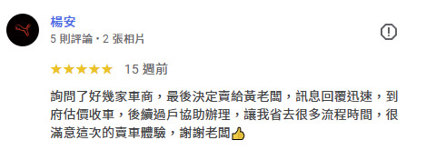 網友五星好評 不只好運到!還幫你多估好幾萬! 真實車主一致推薦的賣車平台,不只價格透明、流程快速,還有專人服務協助成交。免跑車行、免擔心壓價,全流程一對一專人協助,讓你安心成交、現金到手。 LINE免費估車 電話 0937-222-565 關於永發汽車 20年專業,給您最誠實的價格 永發汽車擁有20年以上的二手車買賣經驗,秉持在地經營、誠信為本的理念,陪伴無數車主順利成交,廣受好評。我們了解每一位客戶對愛車的重視,因此堅持透明估價、合理價格、不砍價,讓每一筆交易都公開、公平、值得信賴。無論您是想賣車、換車,或是手上還有貸款、違規未處理,我們都能提供一條龍專業服務,從估價、過戶到清償,協助您快速完成,免除繁瑣手續與不安。選擇永發,等於選擇一個沒有中間商抽成、全程專人服務、現金交易有保障的估車平台。從線上估價到到府收購,我們只用行動證明一句話:👉 價格不只是數字,更是誠意的體現。 LINE免費估車 0937-222-565 4 大承諾 比市價更優的收購條件我們不砍價、不壓價,專業估價系統給您合理、甚至更高的行情。 現金到府收購,快速成交沒煩惱專人到府收車,現金交易當場完成,省時又安心。 便利快速|免出門,線上估價超省事透過我們LINE,直接上傳照片即可快速評估車價,不必舟車勞頓、見面議價,讓您在家就能完成賣車流程。 流程透明|合約簽訂,全程清楚可追溯每一步都建立在雙方共識下簽約進行,明確約定成交金額與過戶時間,確保權責對等,保障您每一分權益。 車主真心推薦 LINE免費估車 電話 0937-222-565 最新成交紀錄 查看更多評價 LINE免費估車 電話 0937-222-565 24 小時線上專人服務,10 分鐘內完成估價並可立即現金成交。提供完整定型化契約,全程保障交易安全。若有貸款問題,也可協助當日清償過戶,免除您的後顧之憂。 永發地址:358苗栗縣苑裡鎮西勢里西勢74之8號 聯繫電話:0937-222-565 加LINE聯絡